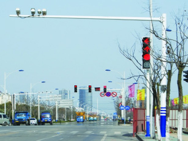 道路監控桿也稱監控桿與監控立桿,立桿要求攝像機離地面高度一般不低于5米,挑臂長度3~5米,立桿下端管徑應在220 mm±10mm、上端管徑應在120 mm±5mm,管壁厚度應≥6mm,表面防腐、抗臺風。立桿基礎深度不低于1.5米,基礎直徑大于1米,采用混凝土灌筑,以確保立桿的牢固度。